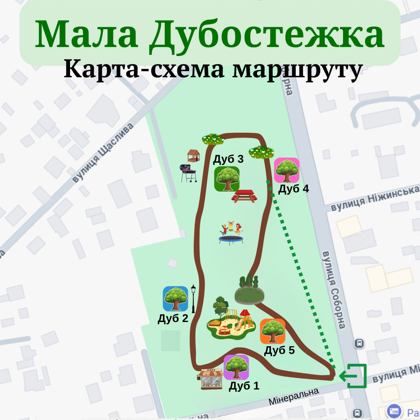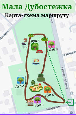 Увійдіть у парк зі сторони перехрестя вулиць Соборна та Мінеральна. Притримуючись лівої сторони, прямуйте в сторону кафе і там побачите Дуб 1. Малої Дубостежки.