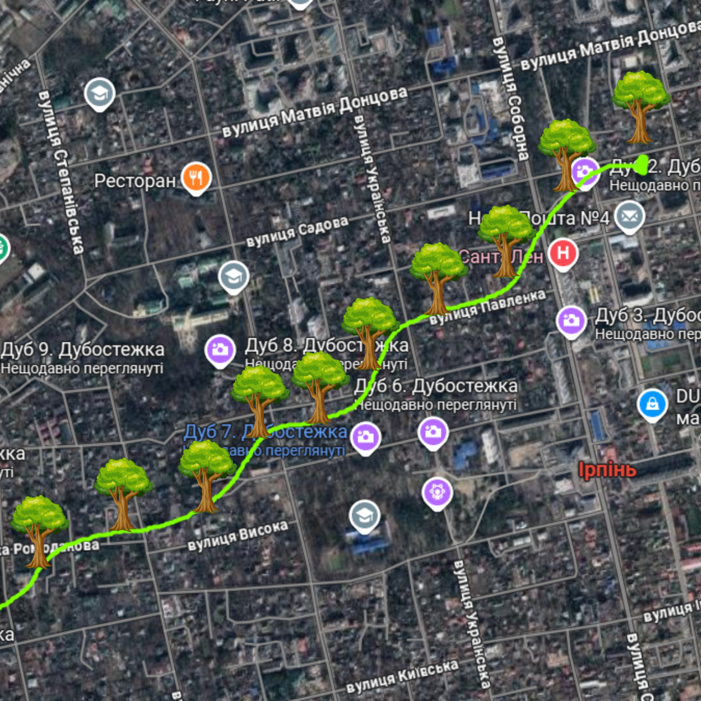 - Прямуйте від Дуба 5 до вулиці Мечникова. Тут вам потрібно пройти до перехрестя з вулицею Українська і повернути наліво. Далі пройти вулицею Українська в напрямку дитячого садочка до Дуб 6. Дубостежка.